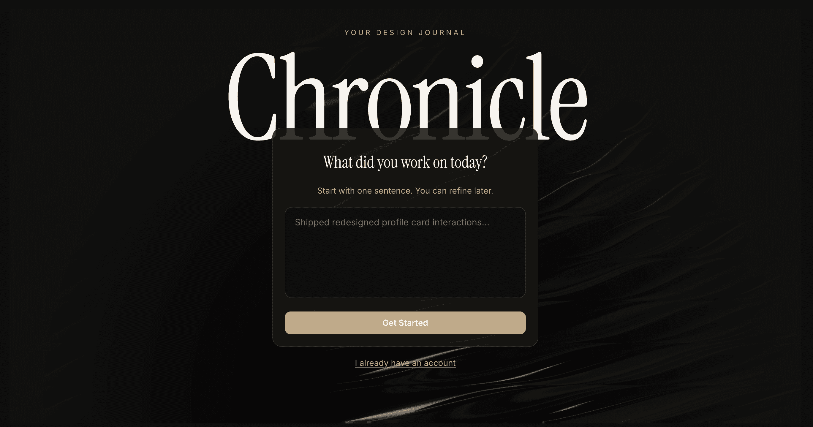 Once you have an account, the logging interface lives at the bottom of the feed. At rest it's a simple input. Start typing, press Enter, entry logged. Hit expand and it grows in place to reveal the full form — one continuous component, no content swapping, text never lost between states.